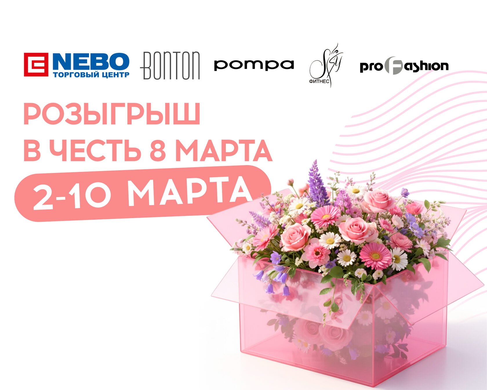 В честь самого главного женского праздника мы в нашей группе ВКонтакте совместно с Bonton, Pompa, Sky фитнес и ПрофМода решили разыграть 3 бокса, каждый из которых достанется кому-то из вас!